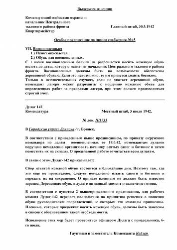 Сообщается, что документ от 3 июля 1942 года был подписан заместителем коменданта лагеря Кайзером. Он приказывал немедленно изъять у военнопленных сапоги и ботинки.