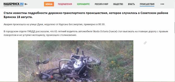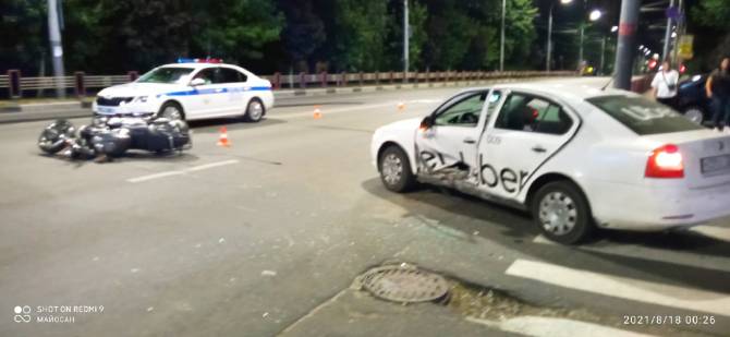 В ночь на 18 августа на улице Дуки в Советском районе Брянска произошла авария. Там на Кургане Бессмертия такси мотоциклист попал под Uber.